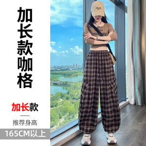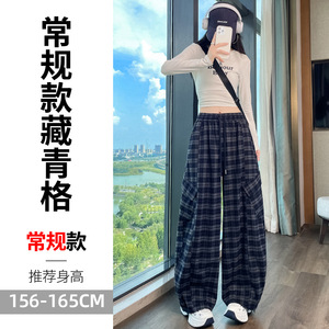 深蓝色格子工装裤女秋冬新款高腰显瘦束脚运动裤小个子休闲阔腿裤