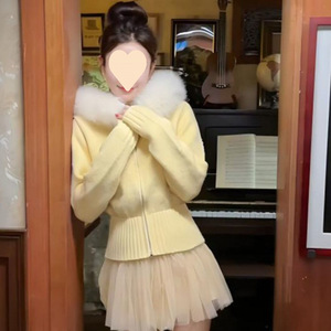 QC小香风毛毛领连帽拉链开衫外穿毛衣女秋冬新款修身显瘦针织衫上