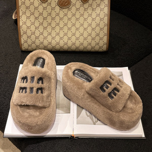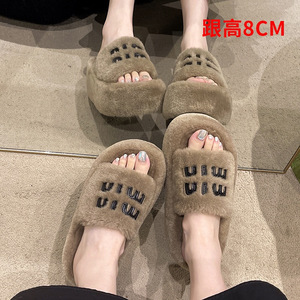 8CM厚底毛毛拖鞋女外穿2025新款秋冬季时尚毛绒字母一字拖棉拖鞋