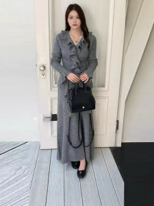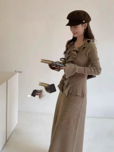 V领毛衣洋气设计感荷叶边上衣半身裙两件套秋秋新款温柔针织套装