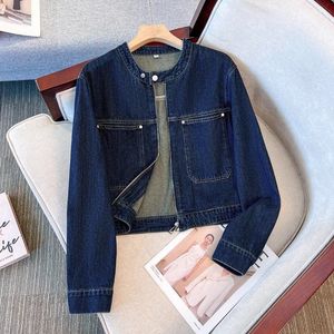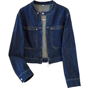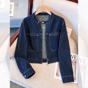深蓝色丹宁圆领牛仔外套女短款年开春秋季新款拉链开衫薄夹克