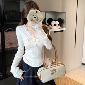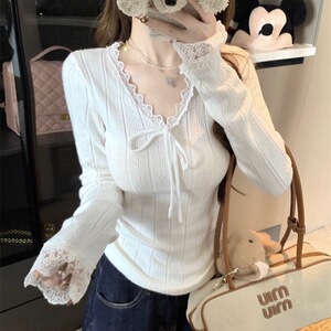 设计感针织衫女早秋氛围感穿搭蕾丝上衣韩系V领修身显瘦长袖上衣