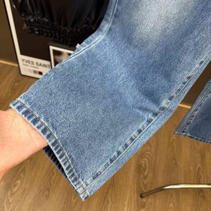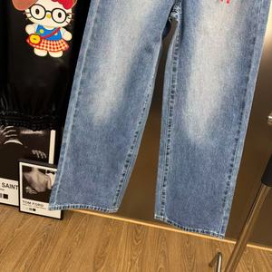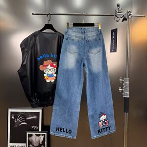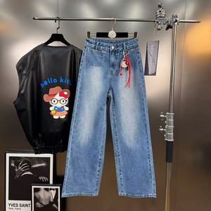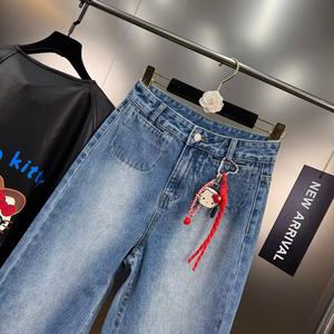 2025年秋季减龄少女风字母卡通猫咪图案挂件装饰直筒牛仔裤