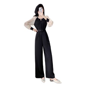 {送腰带}时尚气质减龄黑色长袖连体裤女御姐风气质收腰雪纺阔腿裤