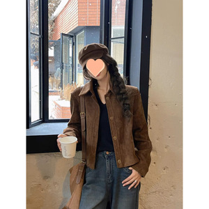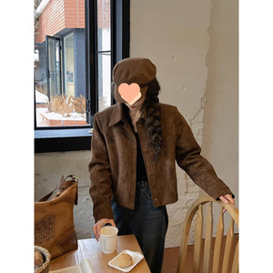 鹿皮绒外套女春秋新款宽松美拉德复古休闲机车短款小个子夹克上衣