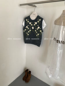 韩系灰色小花圆领立体花朵刺绣针织女叠穿针织背心上衣马甲秋冬