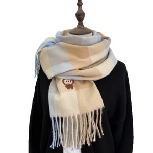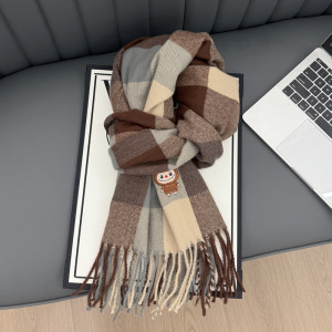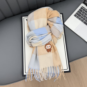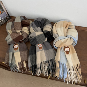 新款刺绣小熊韩系氛围感格纹围巾女秋冬季百搭保暖学生情侣围脖男