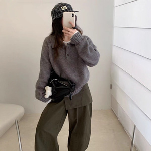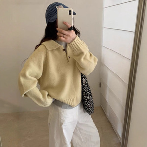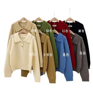 韩系翻领纽扣法式复古套头毛衣女秋冬季短款小个子百搭内搭针织衫