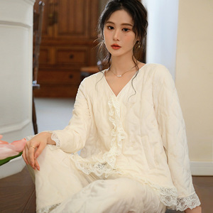 冬季新款睡衣时尚v领夹棉套装蕾丝花边袖口居家保暖可外穿舒适