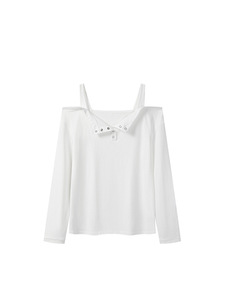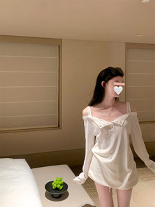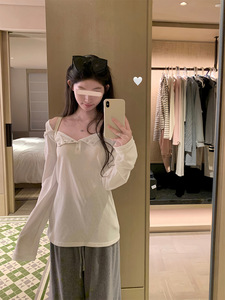 白水籹 韩韩纸片人 一字肩T恤女初秋韩系宽松肌理感纯欲长袖上衣