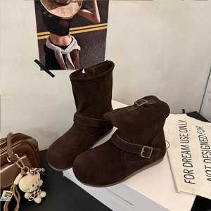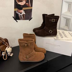 真皮勃肯马丁靴女2025秋新款丑萌堆堆靴平底中筒软底马丁靴西部靴