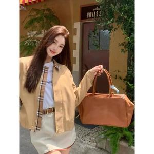 卡其色撞色拼接夹克风衣短外套女秋冬季高级感气质小个子上衣格子