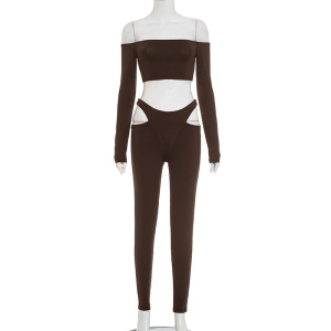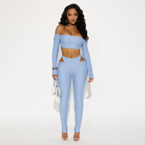 J25ST318欧美风跨境女装秋季一字领露肩短款上衣高腰镂空长裤套装