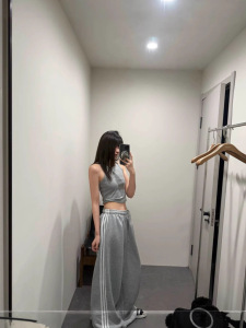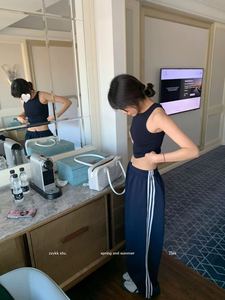 韩国女装高货东大门洋气时尚百搭松紧腰显瘦三条杠简约高腰休闲裤