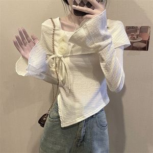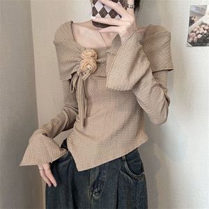 设计感小众法式T恤2025新款女秋内搭立体花朵喇叭长袖掐腰上衣