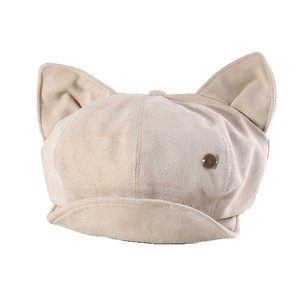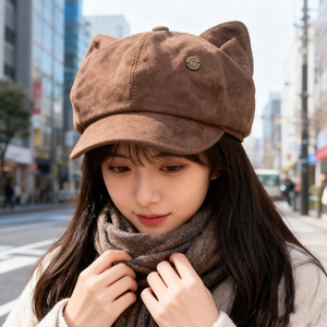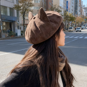 韩版复古麂皮绒猫耳朵帽子女甜美可爱贝雷帽秋冬显脸小画家八角帽
