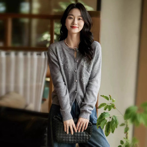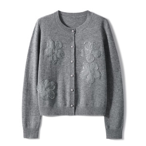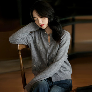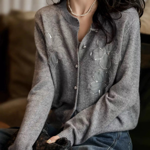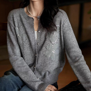 秋季新款 花朵开衫慵懒风设计感重工显瘦羊毛羊绒圆领针织开衫