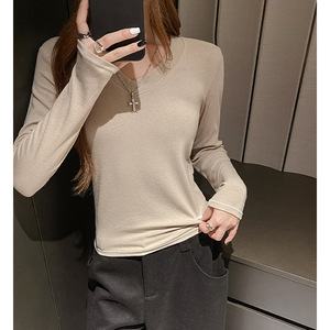 严选V领正肩长袖t恤女秋冬季高级感修身打底衫简约基础款上衣内搭