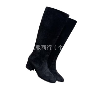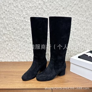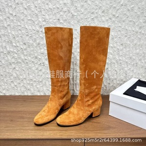 高端2025秋冬新款磨砂真皮圆头复古粗跟高筒长靴时装套筒显瘦女靴