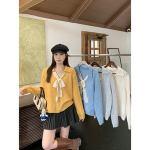 2025秋装新款胖mm大码女温柔风v领系带蝴蝶结针织上衣