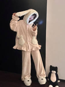 可爱卡通兔耳朵连帽珊瑚绒睡衣女秋冬新款保暖加厚家居服套装外穿