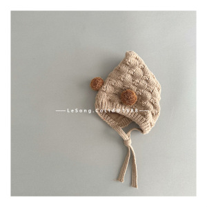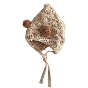 卡其色 毛球格子针织护耳帽