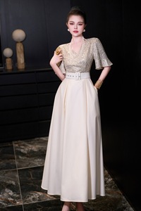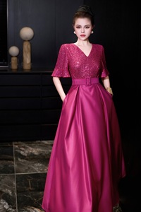 2025新款亮片拼接礼服裙女玫红 V领收腰显瘦长款宴会主持人连衣裙
