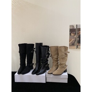 2025年新款秋冬绒面方头粗跟中跟骑士靴女鞋皮带扣高筒靴长靴女