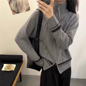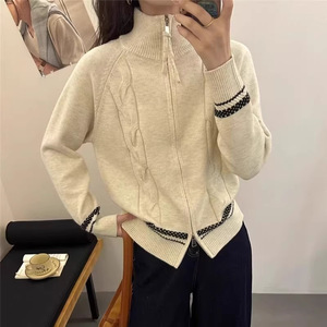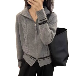 2025秋装新款设计感拉链拼色毛衣女翻领简约休闲针织开衫外套上衣