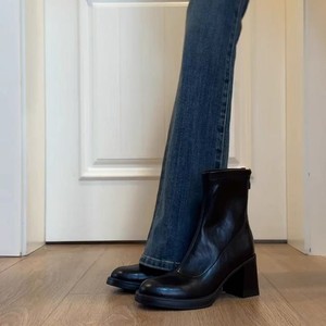 牛皮版~极简新款黑色百搭弹力瘦瘦靴女复古后拉链高跟显瘦小短靴