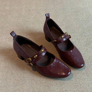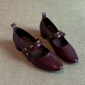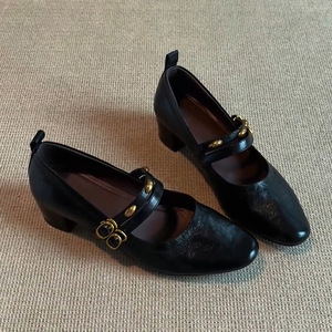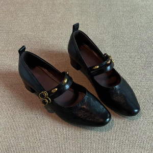 羊皮版~金属一字扣圆头浅口单鞋女粗跟真皮软底百搭通勤玛丽珍鞋