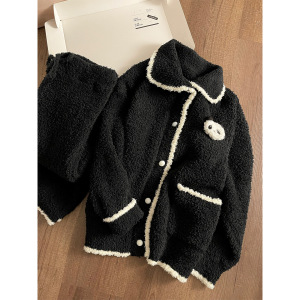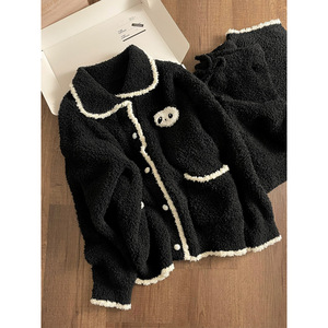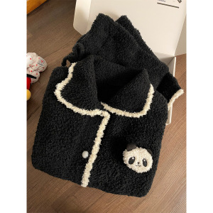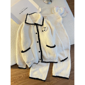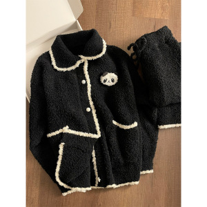韩版黑色熊猫半边绒睡衣女秋冬加绒加厚针织套装可出门保暖家居服
