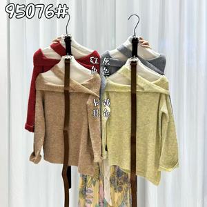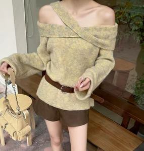 韩系慵懒风一字肩长袖套头毛衣女秋冬季新款宽松显瘦软糯针织上衣