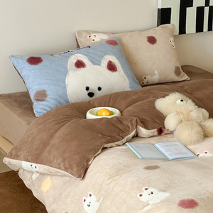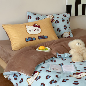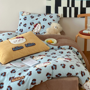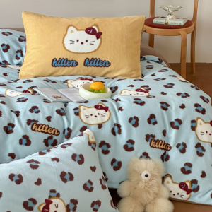 卡通甜酷豹纹KT猫牛奶绒加厚四件套多巴胺双面珊瑚绒被套三件套