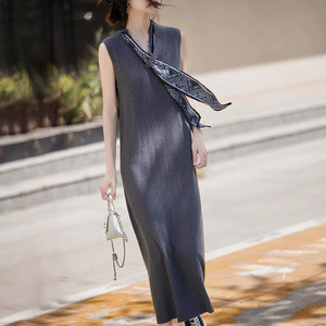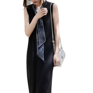 气质轻奢感V领配丝巾无袖针织连衣裙女秋季新款小众显瘦打底长裙