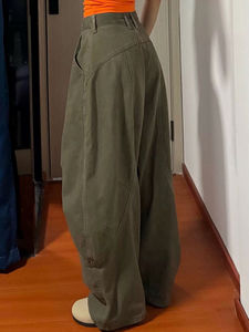 美式复古军绿色弯刀裤子女春秋街头松弛廓形拖地宽松牛仔工装裤