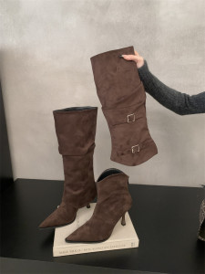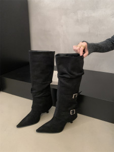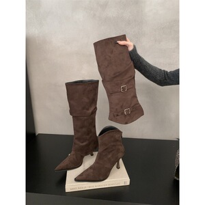 细跟绒面尖头长靴女鞋2025秋冬新款裤管靴两穿时装靴后拉链短靴女
