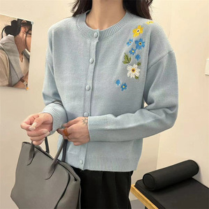 刺绣绣花圆领单排扣毛衣开衫小外套2025秋季新款减龄长袖女针织衫