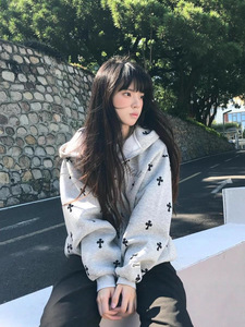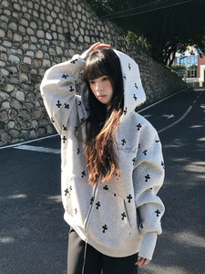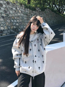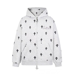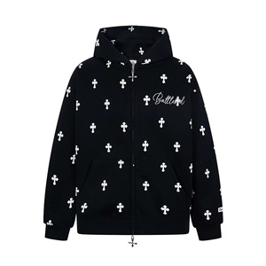 美式潮牌十字架满印字母刺绣开衫连帽卫衣男女休闲风秋季帽衫外套