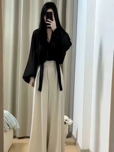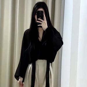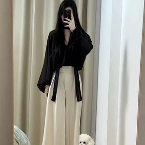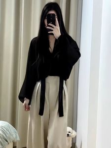 大码胖韩系时尚气质小众设计感飘带领黑色上衣早秋新款一整套