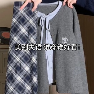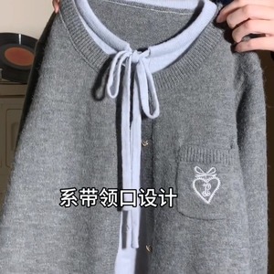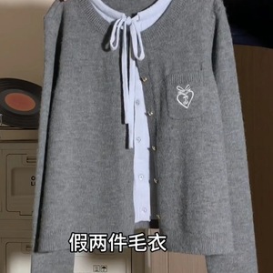 2025秋季假两件灰色针织开衫宽松慵懒风蝴蝶结毛衣外套上衣女