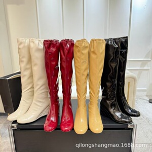 高端2025小香坡跟弹力靴过膝长筒靴后拉链亮面羊皮字母高筒瘦瘦靴