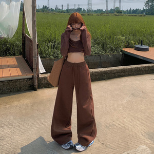 YC&美式高腰宽松阔腿裤百搭抽绳松紧腰运动裤秋冬直筒休闲裤女
