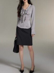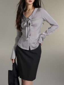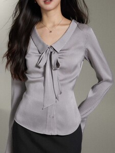 贰羊设计欣颜气质灰色缎面条纹衬衫女翻领飘带通勤高级感衬衣