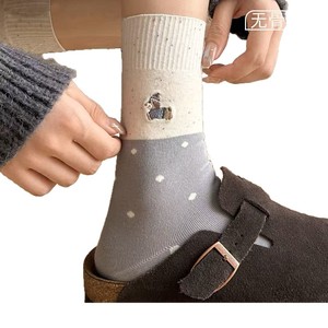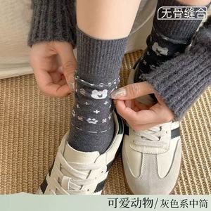 可爱小狗袜子女早秋中筒ins费尔岛植绒韩版灰色卡通甜美百搭袜子