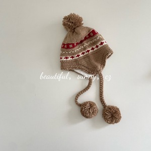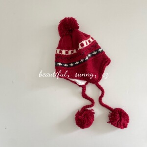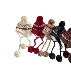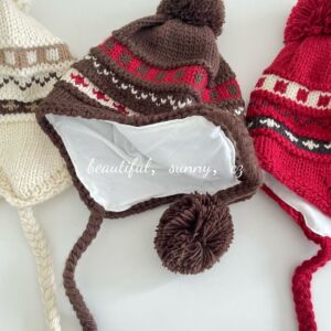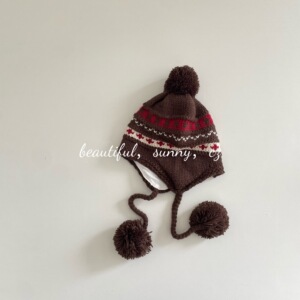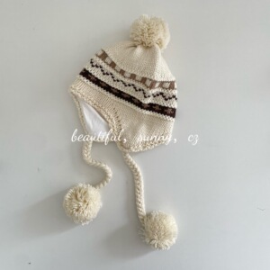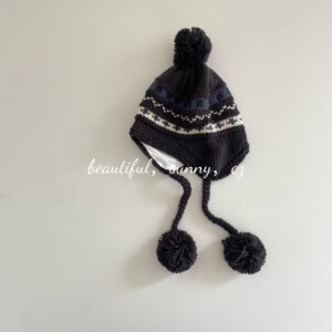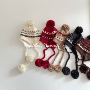 秋冬加厚儿童针织帽韩系复古提花加内里护耳球球毛线帽雷锋帽