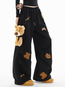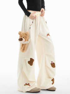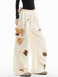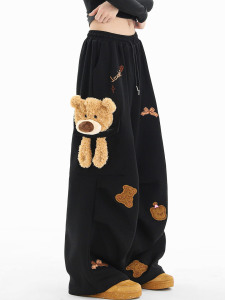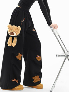 美式复古小熊刺绣运动卫裤男女潮牌痞帅宽松休闲阔腿多口袋工装裤