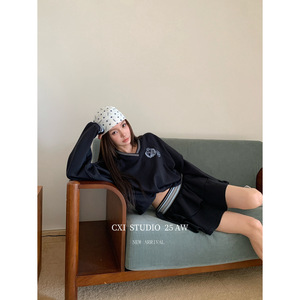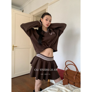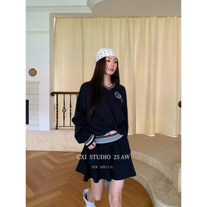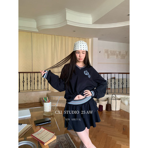 CXI-秋上新美式复古V领拼色miu系套装卫衣+半身裙套装9319