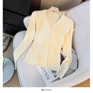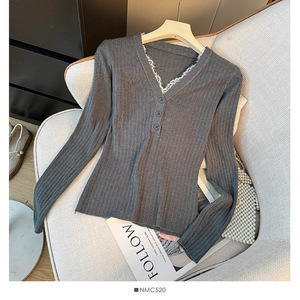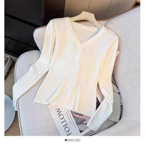 韩系V领拼接蕾丝长袖针织打底衫女秋冬季减龄修身显瘦毛衣上衣女