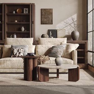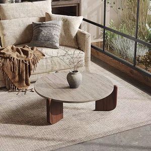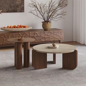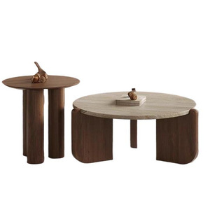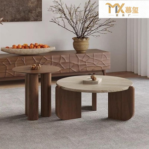 侘寂风岩板实木茶几民宿客厅家用圆形中古风小茶桌大小圆组合